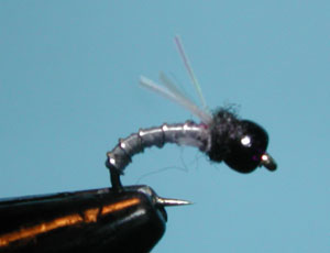 Tying instructions Insert black bead on the hook. Secure thread to the hook near the bead and wind it back to 1/4 down the bend. Tie in short piece of silver wire. Form thin body with thread. Spiral wrap silver wire to form body segments. Tie in two strands of Flashaboo and fold over to form sweptback wings. Cut wings to about ½ of body length. Dub a small thorax right behind the bead with fine black Antron dubbing. Whip finish with a few turns right behind the bead. You’re now off and running. I frequently fish this fly in a two fly rig in combination with another emerger or a Griffith’s Gnat for trout in high Sierra lakes. Enjoy! |